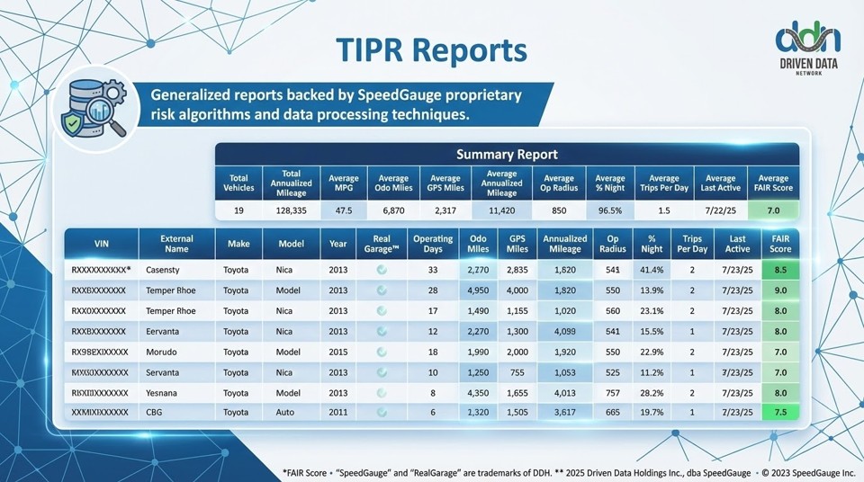 In partnership with over 90 telematics service providers, SpeedGauge provides fleets and their trusted insurance advisors with the Telematics Information Profile Report, or TIPRTM (pronounced “Tipper”), a practical and intuitive risk evaluation tool.